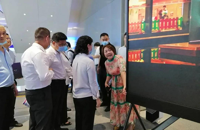 米兰milan总裁龙平芳女士亲自向各位领导讲解了米兰milan的企业定位,以及现场的两款核心产品;其中之一,“沉浸式互动视觉场景”是基于LED显示屏+3D互动数字技术,形成沉浸式视觉场景,主要应用与电影拍摄,文旅,夜游等领域;实现这种沉浸式显示体验,除了需要高端的屏幕显示技术,亦需要内容产业能够提供充分的制作、计算和存储能力。它融合了VR/AR、计算机多媒体技术,视觉内容,呈现新的“显示概念高地”。宝安区郭子平区长现场表示“想不到航城还有这样的好企业,要好好支持!”